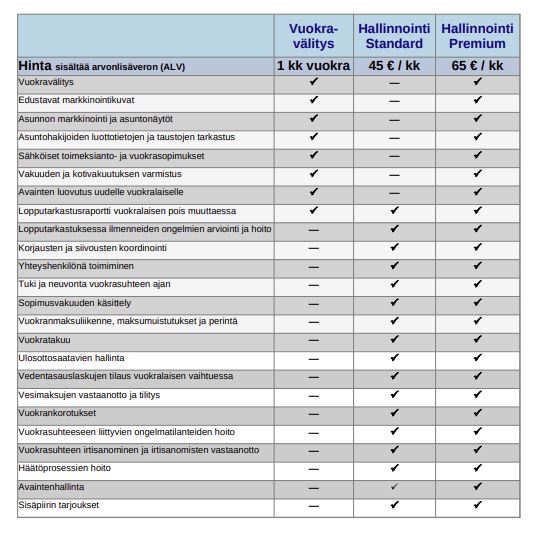 Hallinnointipalkkion hinta on 45 €/kk sis. alv ja se vähennetään automaattisesti vuokranantajalle tilitettävästä vuokrasta.